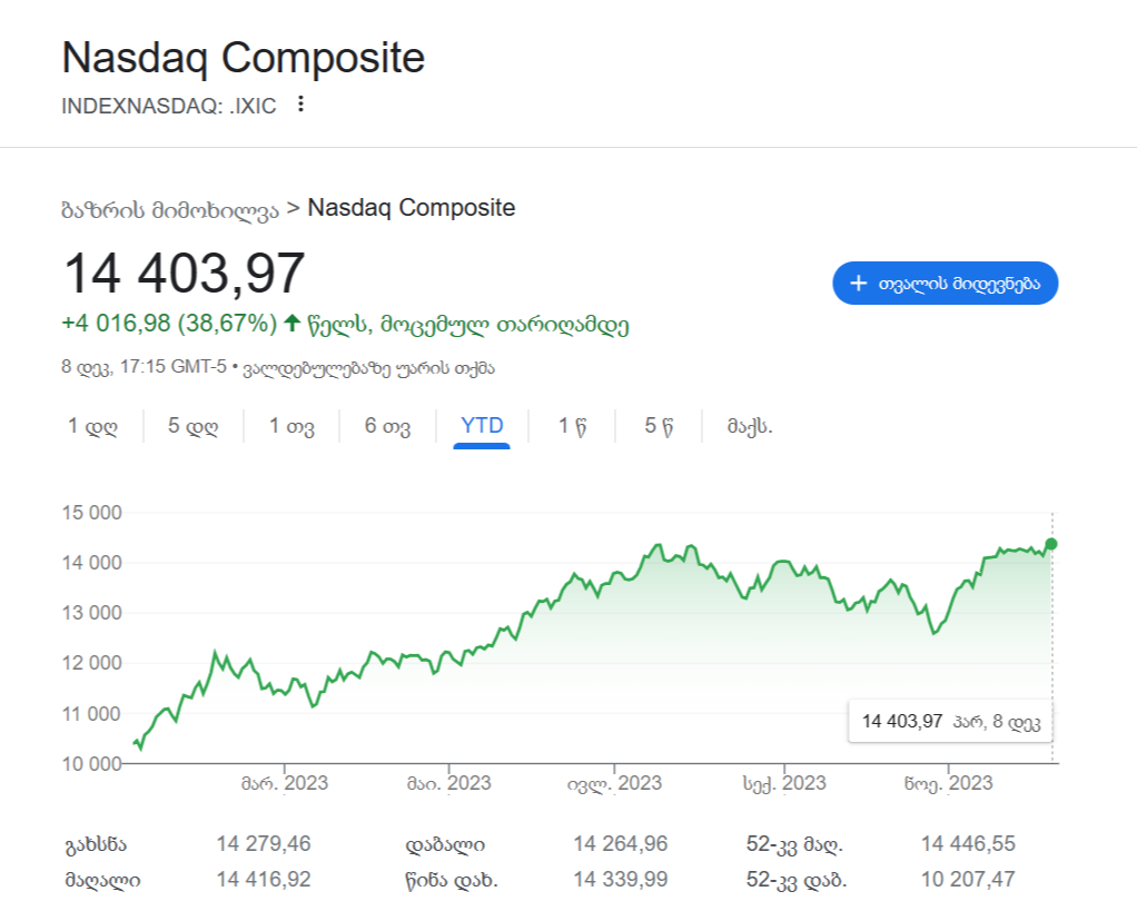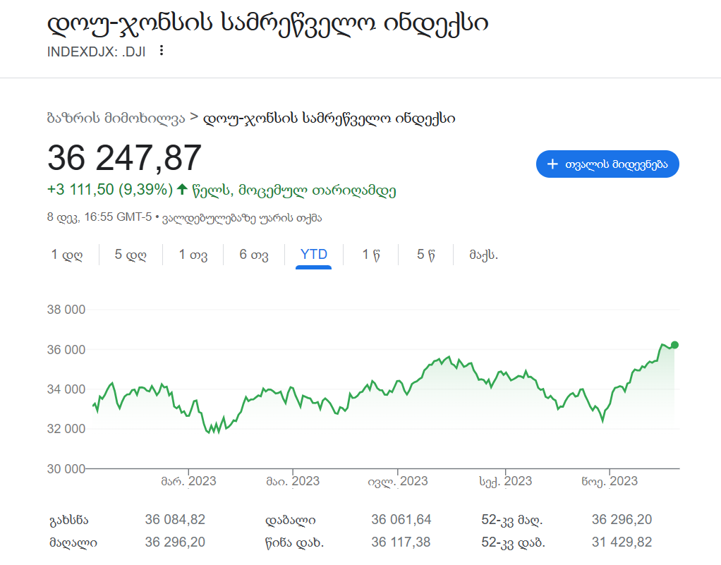 Nasdaq Composite თითქმის 0.5%-ით გაიზარდა და 2022 წლის აპრილის შემდეგ მაქსიმალურ ნიშნულზე დაიხურა, ამასთან S&P 500-მა 0.4%-იანი ზრდით მიაღწია დახურვის მაქსიმალურ მაჩვენებელს გასული წლის მარტის შემდეგ. Dow Jones Industrial Average კი თითქმის 0.4%-ით — 36,247-მდე გაიზარდა, რაც 2022 წლის იანვრის შემდეგ უმაღლეს ნიშნულს წარმოადგენს. უკვე ზედიზედ მეექვსე კვირაა, რაც ეს ინდექსები ზრდას აფიქსირებს.